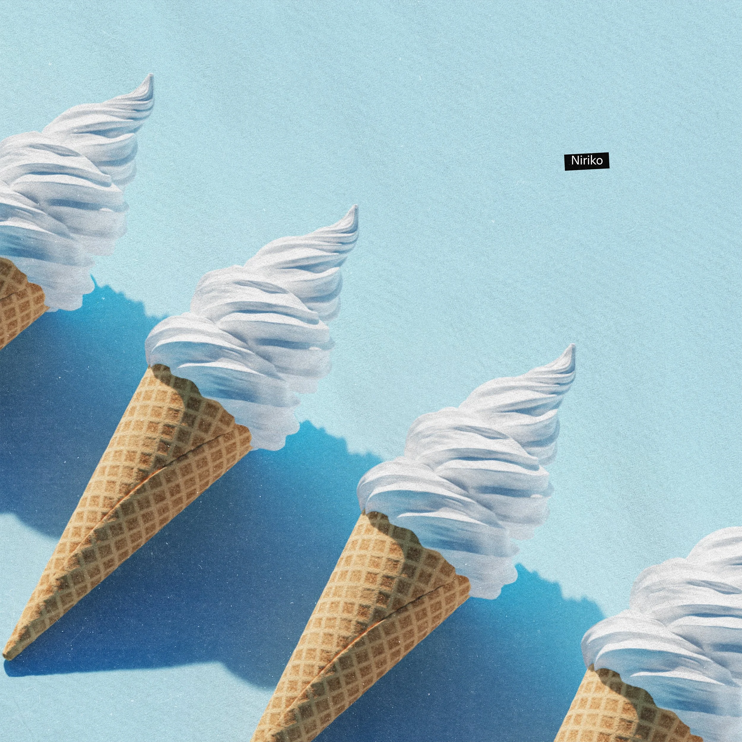 Multiple ice cream cones with white soft serve ice cream against a light blue background.